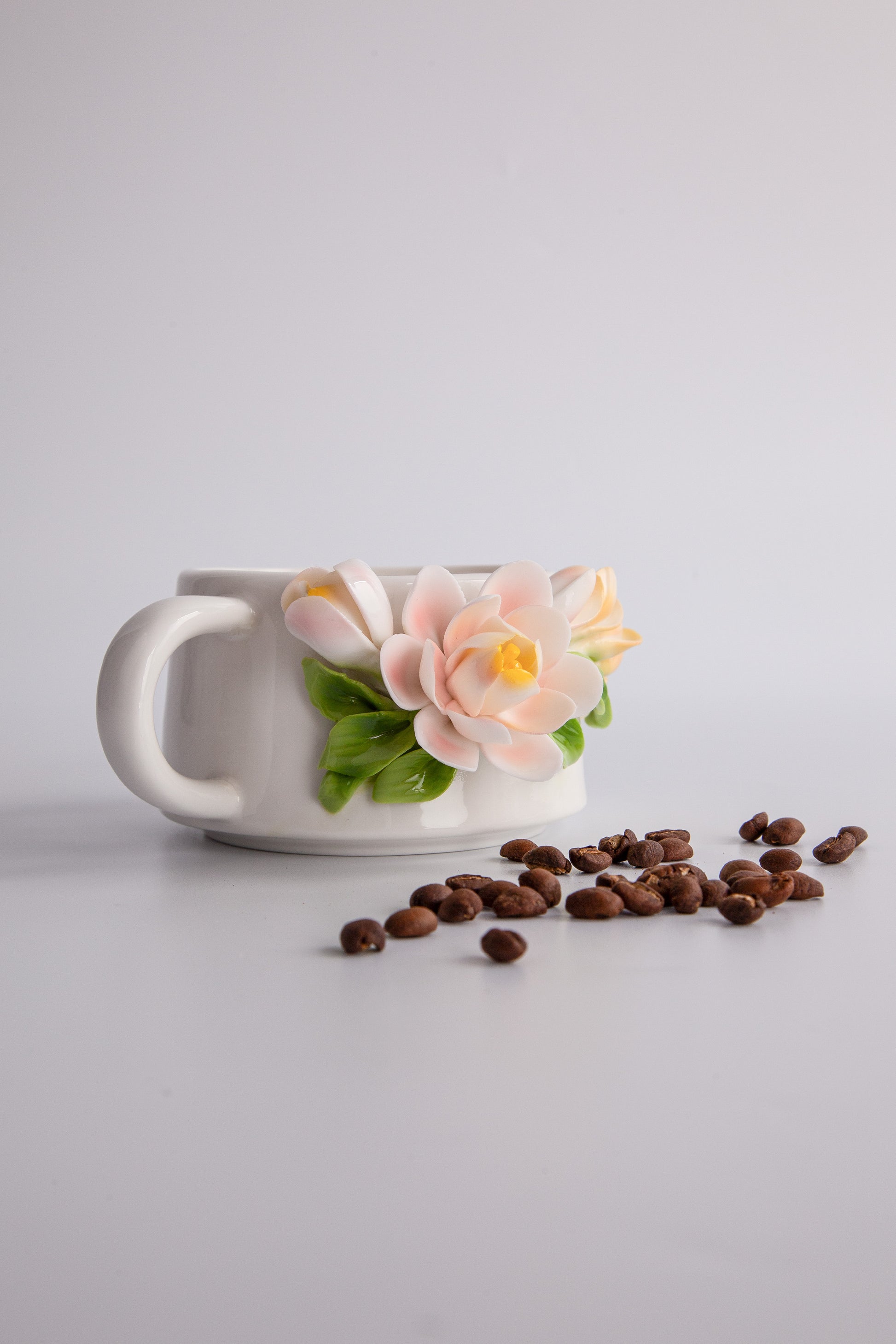 The petals are finished with a soft blush-pink glaze, reminiscent of dawn light or a gentle flush on the skin. Subtle and tender, the hue blends seamlessly into the white base, evoking the natural grace of a camellia in bloom — elegant, understated, and deeply poetic. Fired at 1300°C, the cup is durable, lead-free, and designed for both beauty and everyday use.